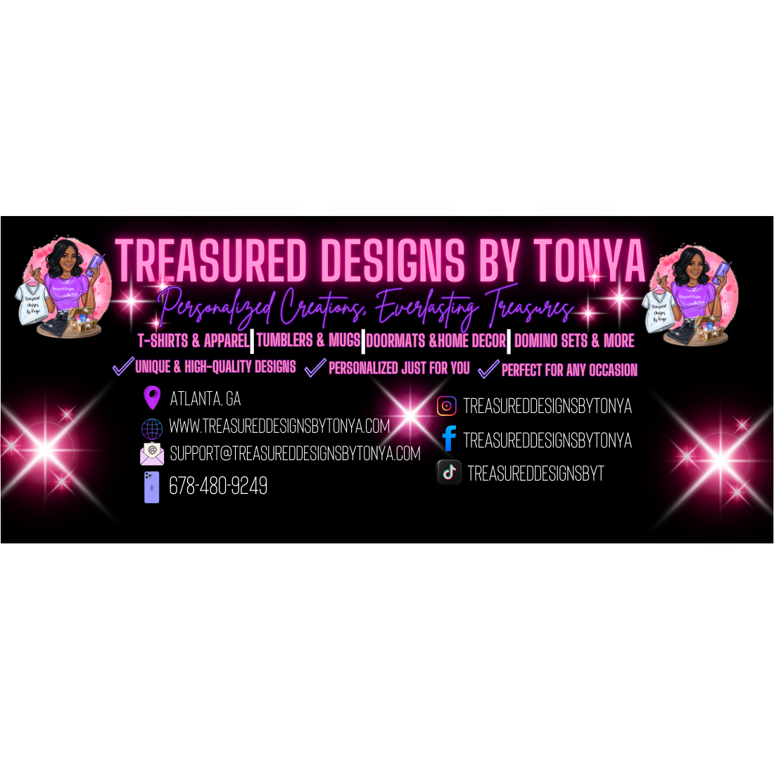 I’m the owner and creative designer behind Treasured Designs by Tonya, a personalized gift brand built on purpose, passion, and the joy of creating meaningful moments. What started as a love for crafting and creativity has grown into a business dedicated to helping people celebrate life through thoughtful, custom-designed products.